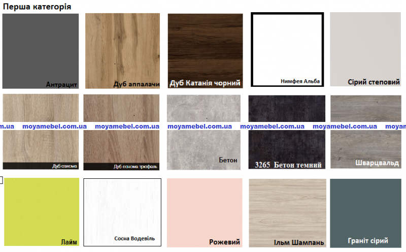 Цвета ЛДСП: антрацит, дуб аппалачи, дуб Катания черный, нимфея альба, серый степной, дуб сонома, дуб сонома трюфель, бетон, бетон темный, Шварцвальд, лайм, сосна водевиль, розовый, ильм шампань, гранит серый