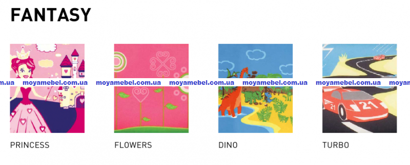 Обивка: тканина Cagliary, тканина Zesta, тканина Twister, тканина дитяча, тканина Alba, тканина Comics, тканина Spray, тканина Sempre, тканина Мicrofibre, тканина Lusso, тканина Fiji, тканина Fantasy, тканина Happy Animals, екошкіра V, екошкіра EV, тканина Teenart