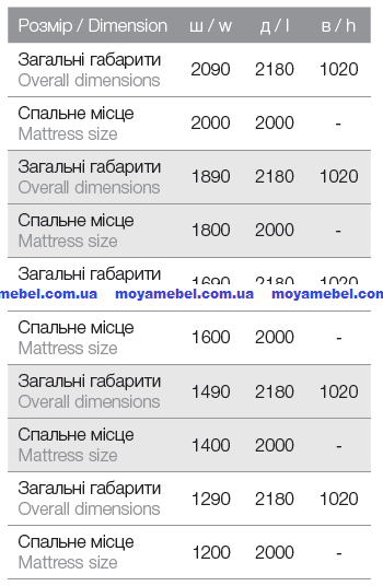 Спальне місце: 2000х1200/1400/1600/1800/2000 мм
