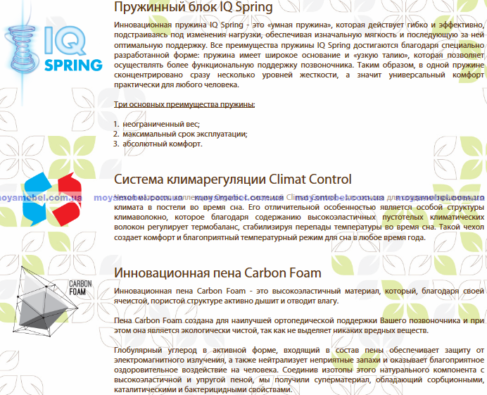 Безпружинний ортопедичний блок Carbon Foam - інноваційна піна, високоеластичний матеріал, який, завдяки своїй комірчастої, пористій структурі активно дихає і відводить вологу. Піна Carbon Foam створена для наилудшую ортопедичної підтримки Вашого хребта і при цьому вона є екологічно чистою, так як не виділяє ніяких шкідливих речовин. Глобулярний вуглець в активній формі, що входить до складу піни, забезпечує захист від електромагнітного випромінювання, а також нейтралізує неприємні запахи і надає сприятливу оздоровчий вплив на людину. Поєднавши ізотопи цього натурального компонента з високо-еластичної і пружної піною, ми отримали суперматеріал, що володіє сорбційними, каталітичними та бактерицидними властивостями.